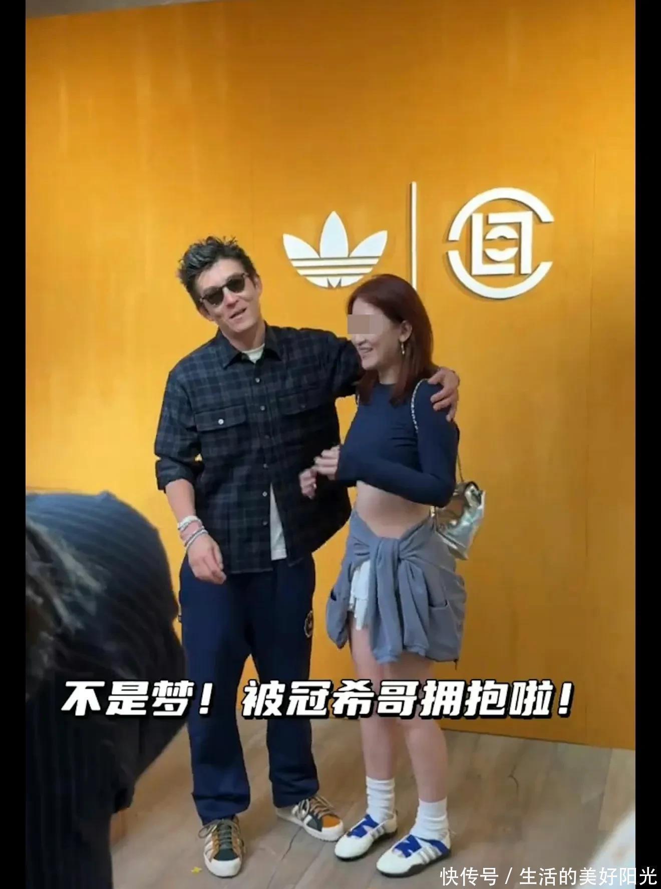 这位女网友看着大概二十来岁,自己说平时是做潮流博主的,在小红书上有差不多2000个粉丝。当天她穿了件紧身露腰上衣,配着超短裙,看着很青春,身材也很惹眼。她排了好久的队才进店里见到偶像,当时陈冠希也穿得很潮,还戴着墨镜,有人说他的发型看着有年轻时的感觉,颜值简直像回到了巅峰时期。面对这位年轻女粉丝,陈冠希主动伸出左手搭在她的肩膀上,很有男子气概地把她往自己结实的胸膛带,最后两人紧紧贴在一起,互相用手抱着对方,画面看着特别亲密。女网友也马上伸手抱住了陈冠希的腰,能看出来两人对这次拥抱都特别开心。